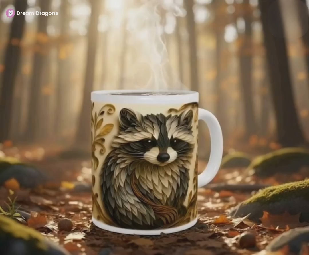 The design features a stunning, detailed illustration executed in a charming quilling-style art technique, highlighting a charismatic raccoon as its centerpiece. This raccoon mug goes beyond simple function, serving as a piece of usable art that celebrates the beauty of the forest.