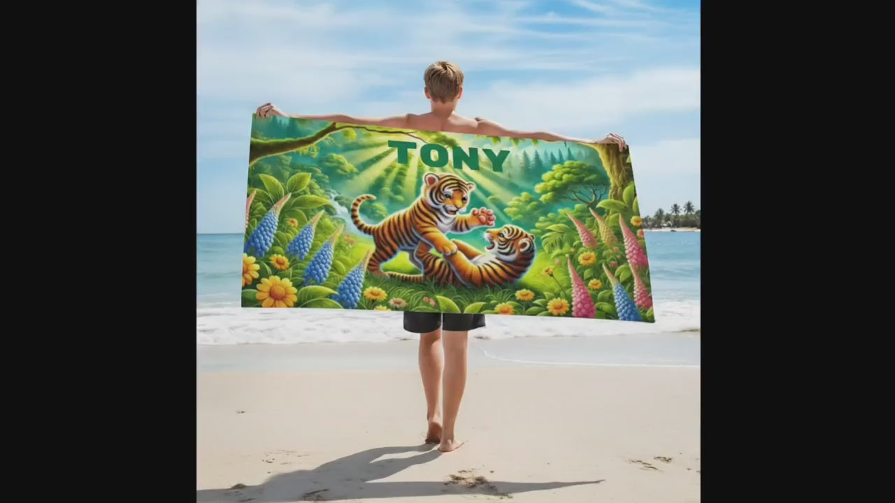 Plongez dans une aventure magique au cœur de la jungle avec notre serviette de plage personnalisée pour enfants , ornée d'adorables tigres espiègles dans un décor tropical vibrant. Cette serviette en microfibre ultra-douce est non seulement charmante, mais aussi incroyablement confortable, offrant une sensation de chaleur et de douceur pour la peau délicate de votre enfant. La personnalisation unique avec le nom de votre enfant transforme cette serviette en un cadeau précieux et attentionné, idéal pour les anniversaires, les vacances, les sorties à la plage, les cours de natation et les aventures en famille.